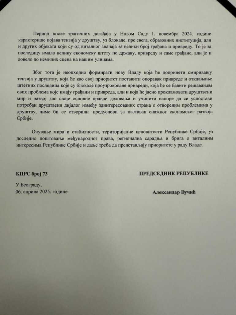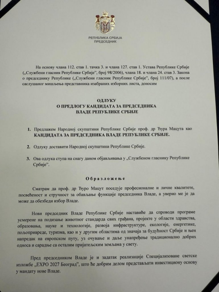 – Donosim odluku o predlogu kandidata za predsednika vlade Republike Srbije. Tačka 1. Predlažem Narodnoj skupštini Republike Srbije profesora doktora Đuru Macuta kao kandidata za predsednika vlade Republike Srbije. Tačka 2. Odluku dostaviti Narodnoj skupštini Republike Srbije. Tačka 3. Ova odluka stupa na snagu danom objavljivanja u službenom glasniku Republike Srbije. Obrazloženje. Smatram da profesor doktor Đuro Macut poseduje profesionalne i lične kvalitete, posvećenost i stručnost za obavljanje funkcije predsednika vlade, a uverio me je da može da obezbedi izbor vlade. Novi predsednik vlade Republike Srbije nastaviće da sprovodi programe usmerene na podizanje životnog standarda svih građana, projekte u oblasti zdravstva, obrazovanja, nauke i tehnologije, razvoja infrastrukture, ekologije, energetike, poljoprivrede, turizma, kao i u drugim oblastima od značaja za budućnost Srbije i njen napredak na evropskom putu uz očuvanje i dalje unapređenje tradicionalno dobrih odnosa i saradnje sa prijateljskim zemljama u svetu. Pred predsednikom vlade je zadatak realizacije specijalizovane svetske izložbe EXPO 27 Beograd, što će dobrim delom predstavljati investicionu osnovu u mandatu nove vlade – pročitao je Vučić.